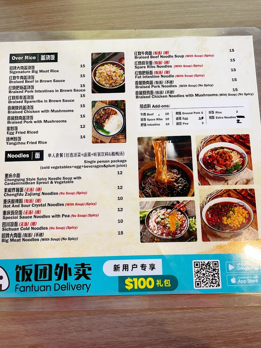 Big meat Noodles ("Da Rou Mian" or "Stewed Noodles"): This traditional Chinese dish features wide noodles served in a rich broth with a variety of meats, vegetables, and flavorful broth. The meat can include pork, and vegetables like onions and baby bokchoy are commonly added. The dish is known for its hearty broth and generous ingredients, creating a delicious and satisfying meal.